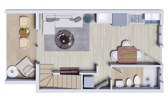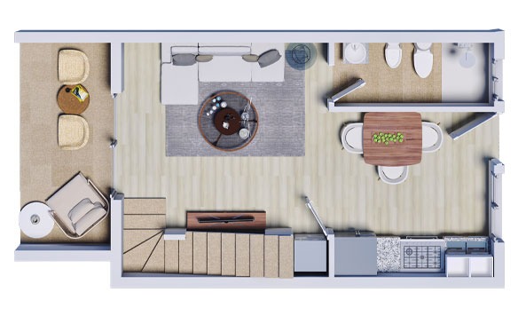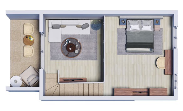 This 55 square foot suite has everything you need for rest and relaxation. The master bedroom comes furnished with a king-size bed for ultimate luxury. A kitchen and dining area comes with everything you need from pots and pans to silverware and dishes.