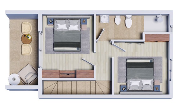 Both bedrooms are situated on the second floor where also the second bathroom is located for complete privacy when travling with a larger family or another couple. The 2 Bedroom unit has everything you need for the ultimate vacation.